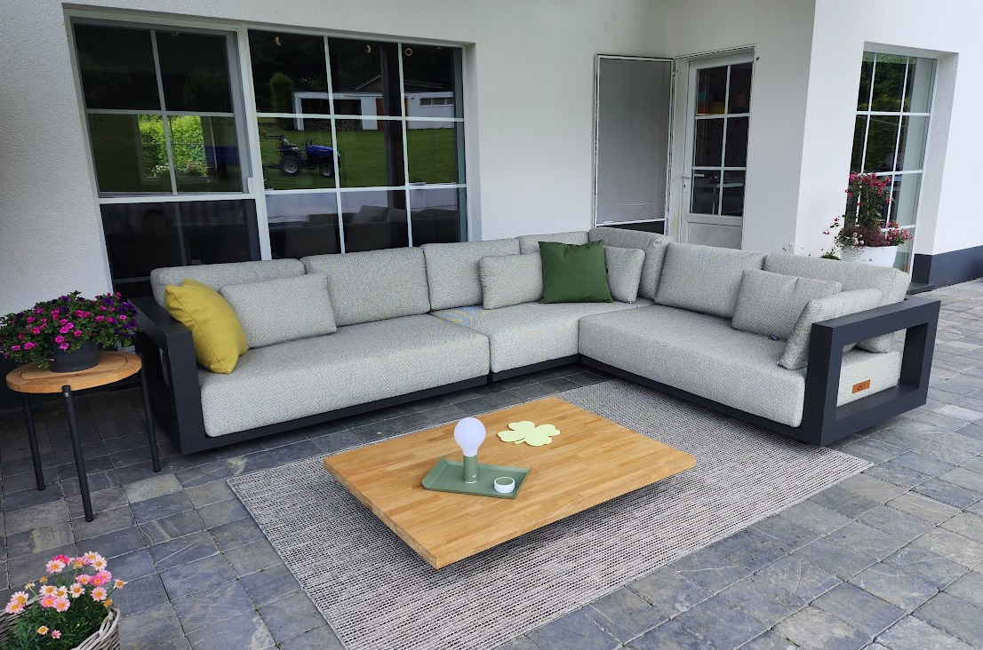 Salon de jardin Metropolitan et transats de la marque 4 Seasons Outdoor, avec des structures en aluminium finition anthracite.