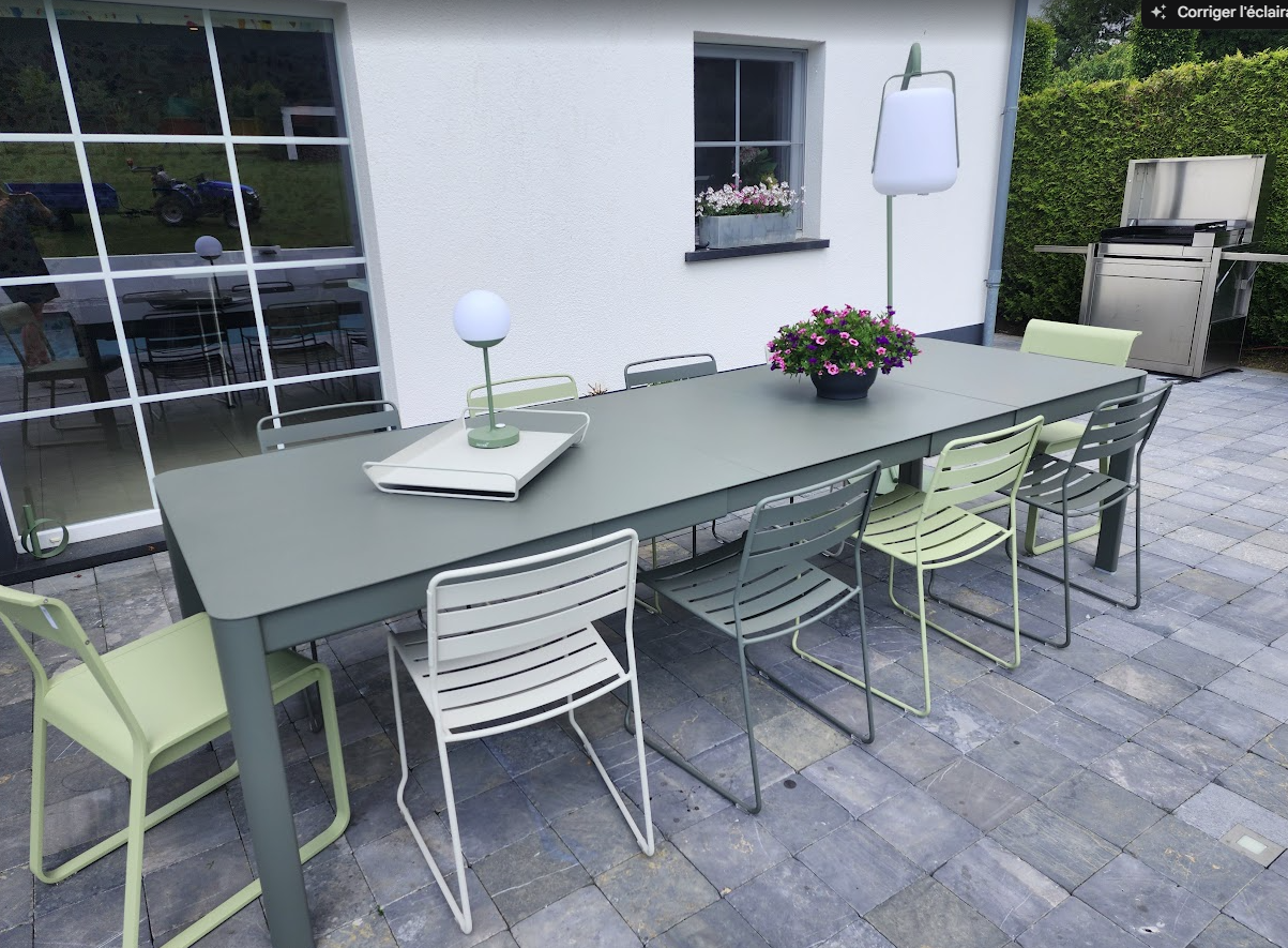 L'ensemble table et chaises est signé Fermob : il comprend la table extensible Ribambelle, accompagnée de 8 chaises Surprising et de 2 chaises Bellevie.